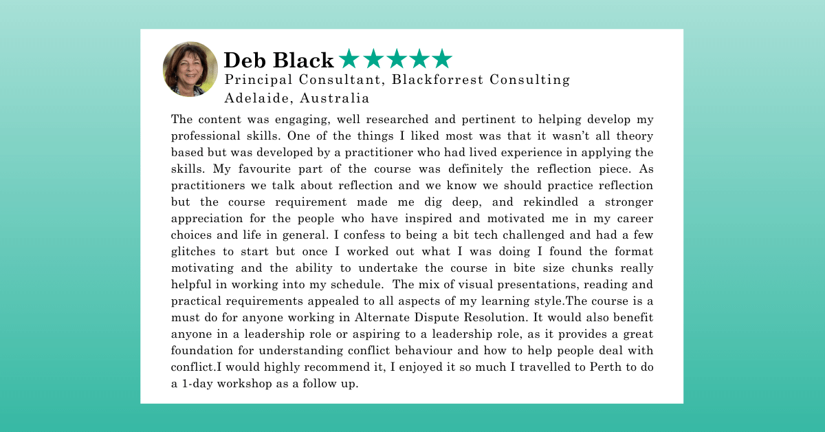 Conflict Management Academy offers a full suite of mediation and conflict management training options, from webinars and introductory short courses through to the Nationally Accredited Mediator Training Program, fully compliant with the Australian Mediation and Dispute Resolution Accreditation Standards (AMDRAS). Our programs combine practical skill-building, individualised support and mentoring, and accessible delivery modes to prepare you for real-world practice.