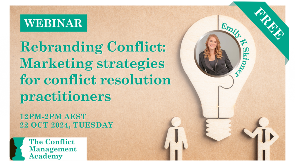 In her thesis, Emily comes up with some persuasive arguments to explain the conundrum that there is a high social need for conflict resolution services, but low market demand. She identifies practitioners’ assumptions, expectations and knowledge about conflict and conflict resolution and how they influence the way practitioners market their services.  She also interviews millennials (the fastest growing target market in the next ten to fifteen years) and notes the very different way they think about conflict and conflict resolution.  She highlights the mismatch between the way practitioners attempt to communicate with their market and what is likely to attract millennials’ attention.