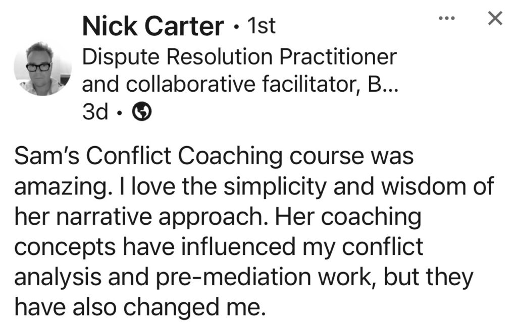 Sam has been accredited as a mediator under the Australian National Mediation Accreditation System and is a Certified Transformative Mediator by the US Institute of Conflict Transformation. She is a Certified Narrative Coach.
