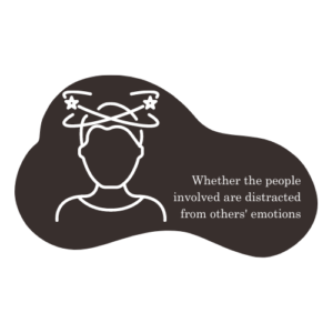 If we are stuck in a quiet room with someone who is overtly expressing their emotions, this is likely to be hard to ignore, and will have more of an impact on us than if we are in a busy public place where there’s lots going on around us. We may also be distracted by internal distractors (how we are feeling, or something else that’s preoccupying our thoughts). Distractions can be useful as a regulation tool in conflict – sometimes they happen naturally, but we can also consciously distract ourselves from emotions that are unhelpful.